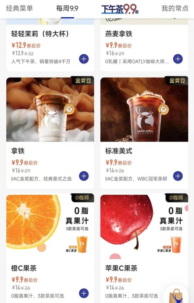 如今只有拿铁、美式和燕麦拿铁可以维持在小程序上。 9.9 元的价格