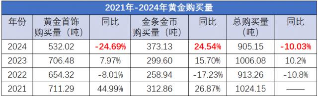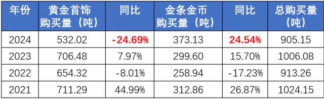 去年黄金首饰的购买量只有 532.02 吨,相比 2023 年降低 174.46 吨,跌幅达到 24.69%