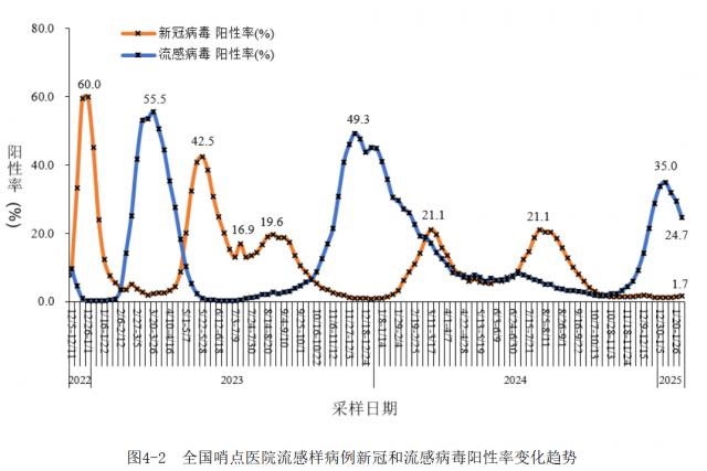 在 12 月 30 日至 1 月 26 日的 28 天空中,流感病毒的检出率从 35% 降到 24.7%,虽然有所下降,但与同期相比仍然比较严重。