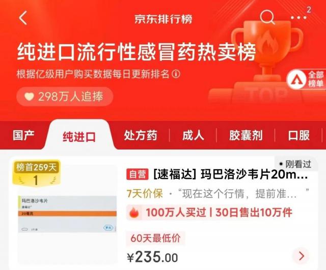 其中一种叫玛巴洛沙韦的治疗流感药物成功登上JD.COM进口流感榜榜首。