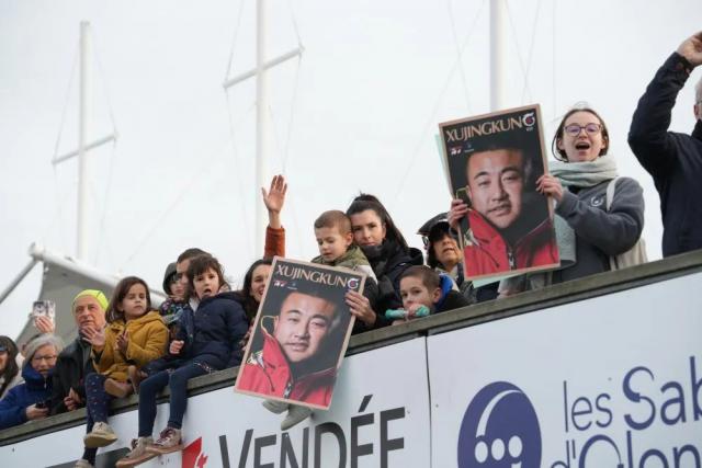 随着船舶驶入港口的航线,两侧防波堤上等待的人们爆发出热烈的掌声和欢呼声。人群中不仅有挥舞着中国国旗的同胞,还有许多法国当地的航海运动爱好者。许多法国孩子兴奋地踮起脚尖,挥舞着他们的画刊。一些孩子试图用生硬的中文发音喊道:“京坤!京坤!”