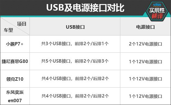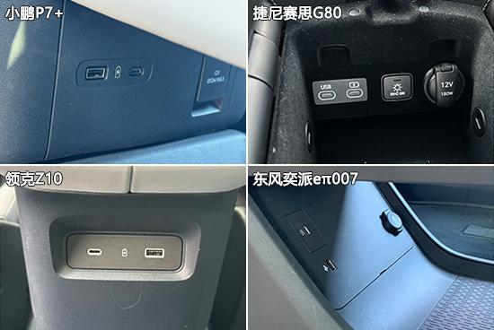 捷尼赛思充电插座 G80 以数量取胜,整车配置高达 5 个 USB 接口,但都是 USB Type-C 规格,类型单一。另外三款车都提供了 Type-A 和 Type-C 两类接口,其中,东风奕派 e π 007 的 USB 充电接口布局更加合理,前后排各自配置 1 个 USB Type-A 接口和 1 个 USB Type-C 接口,能最大限度地满足不同移动设备的充电需求。电源接口方面,小鹏 P7 整车提供了 2 个 12V 电源接口,数量领先于其它三款车型。