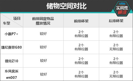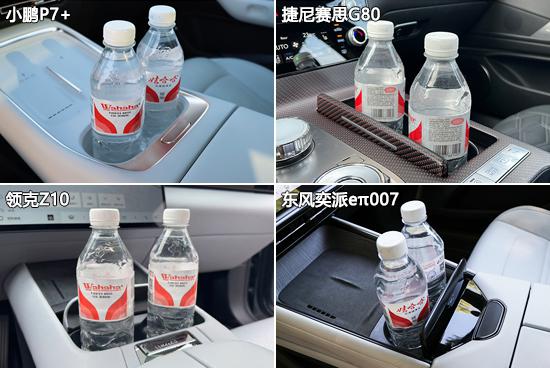 小鹏在杯架检测中 P7 和领克 Z10 前后排各配置 2 一个杯架,而且都提供了限位器,性能比较好。捷尼赛思 G80 和东风奕派 e π 007 虽然配置相同 4 一个杯架,但只有前排杯架提供了限位器,缺乏实用性能。
