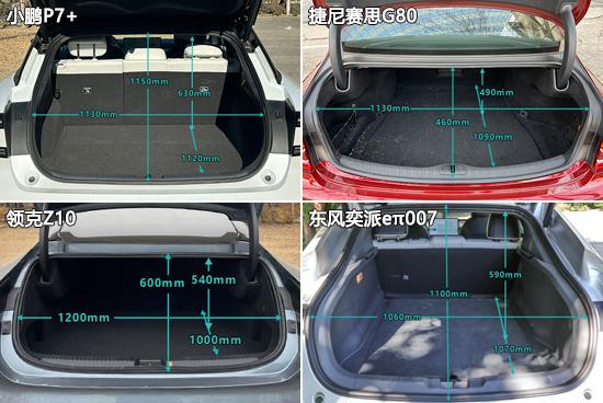 在后备箱尺寸方面,小鹏 P7 成绩突出,各种检测值均超过同级平均水平,实用性能优异。具体来说,小鹏 P7 和东风奕派 e π 007 因为采用了掀背式设计,所以在后备箱的张口长度和后备箱的垂直高度方面具有明显的优势。后备箱张口总宽度方面,领克 Z10 检测值为 1200mm,成绩达到同级别上游水平,小鹏 P7 和捷尼赛思 G80 还达到了同级中游水平。在后备箱深度检测中,除领克 Z10 另外,其它三款车均超过同级检测平均值。