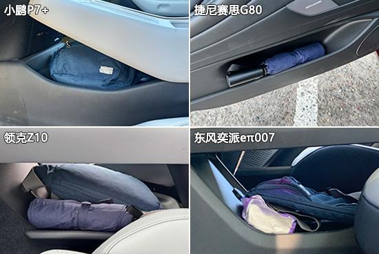 在车内储物空间方面,领克 Z10 和东风奕派 e π 007 整车均是 14 一个储物空间(不包括杯架),捷尼赛思 G80 整车共计 13 一个收纳空间,而小鹏 P7 整车只有 11 一个储物空间,数量不如其他三款车。在实际测量过程中,由于四款车都没有配备专属眼镜盒,上述固定物品中的太阳镜无法合理放置在车内,但其他物品可以找到合适的存放空间。