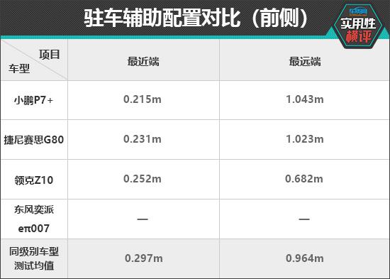 驻车辅助配置方面,在前驻车雷达检测中,根据现有的测试数据,小鹏 P7 和捷尼赛思 G80 最远的探测距离都超过了 1m,雷达功率表现不错。最近提醒距离方面,小鹏 P7 、捷尼赛思 G80 和领克 Z10 三款车或多或少与测试平均值有差距。