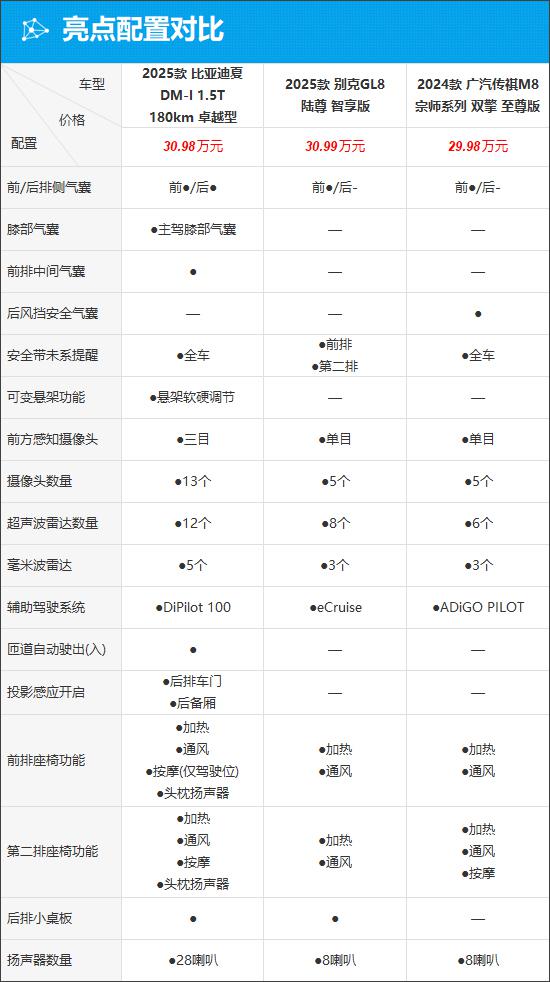 具体来说,在车辆配置方面,我们选择了价格尽可能相似的车型。配置方面,比亚迪夏的综合表现领先,专属驾驶员膝部安全气囊、前排中间安全气囊、悬架软硬调节、投射感应打开后门。 / 后备箱等,在安全性和方便性方面表现出色。相比之下,别克 GL8 与传祺 M8 表现相当,相互胜负,但整体表现与比亚迪夏仍有一定差距。