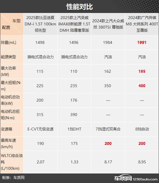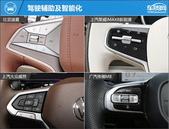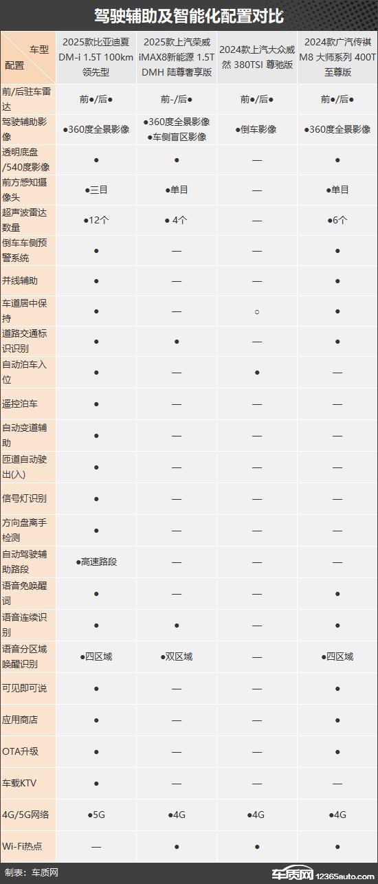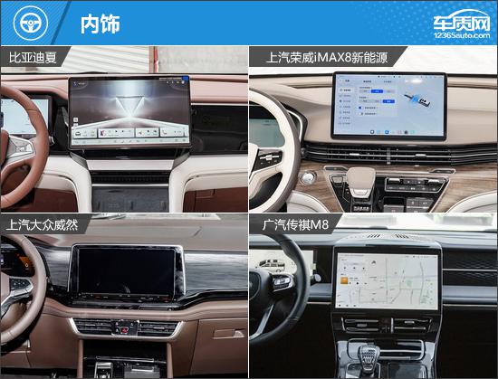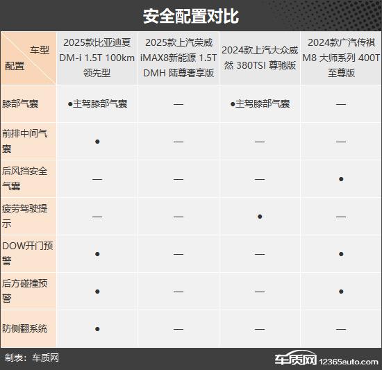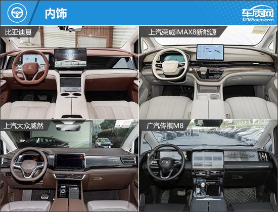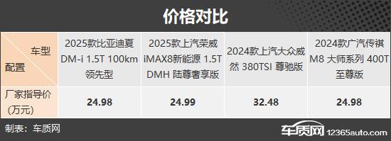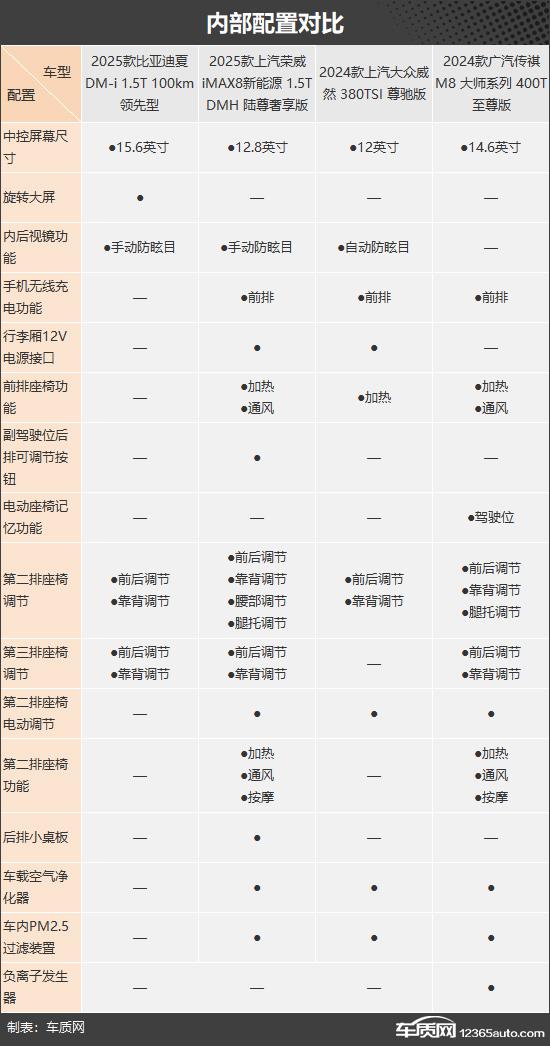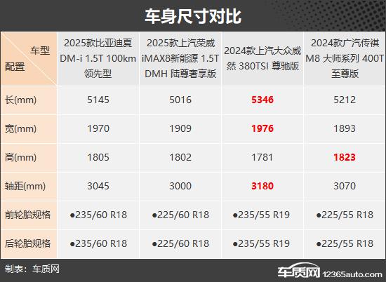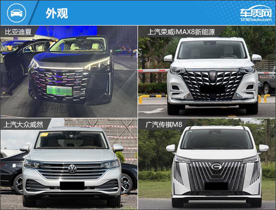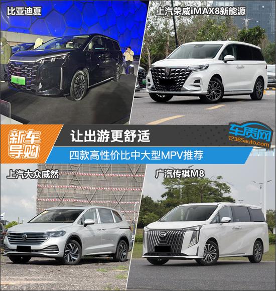 我们这次推荐的四款车分别是 2025 款比亚迪夏 DM-i 1.5T 100km 领先(以下简称:比亚迪夏)、2025 款上汽荣威 iMAX8 新能源 1.5T DMH 陆尊豪享版(以下简称荣威) iMAX8)、2024 款上汽大众威然 380TSI 尊驰版(以下简称:大众威然)和 2024 款广汽传祺 M8 大师系列 400T 至尊版(以下简称传祺) M8)。四款车均定位为中大型车。 MPV,并且能满足目标客户的多方面需求。四款车均定位为中大型车。 MPV,并且可以满足目标客户的各种需求。(因为现在照片数量少,所以有些车型的照片并不是相应的具体款式)