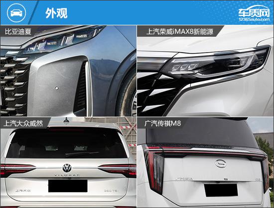 在外观设计方面,四款车都采用了家族化的设计风格,具有较高的辨识度。四款车的正面都配有大尺寸的进气格栅。除了大众威然,三款车型的前格栅都是上下贯通设计,有很强的厚重感。比亚迪夏和荣威在其中 iMAX8 前格栅内部采用点阵元素,传祺 M8 前格栅的“越迁光栅”,整体呈现 V 字型;大众威然虽然前格栅的整体尺寸略小,但是通过镀铬装饰条来拉伸视觉宽度。
