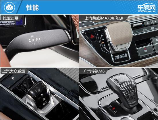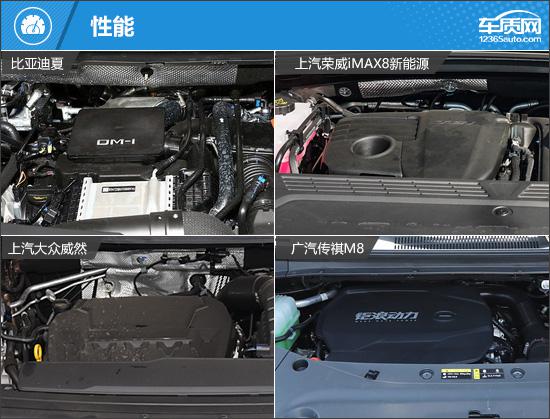 动力方面,四款车在能源类型上有所不同,比亚迪夏和荣威 iMAX8 大众威然和传祺为插电式混合动力。 M8 为汽油。就参数而言,传祺 M8 发动机最大功率,最大扭矩最好。在燃油经济方面,荣威选择了插电式混合动力系统。 iMAX8 表现更好,WLTC 全面油耗仅为 在四款车中,1.33L/100km是最低的;同时,由于电机的帮助,其低速动力响应也会更好。
