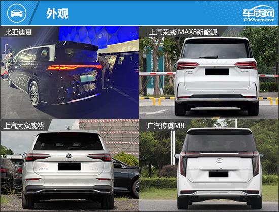 在汽车的后部,四款车都采用了饱满大气的设计风格,通过大量的直线应用,可以获得更稳定的视觉效果。比亚迪夏和传祺 M8 选择贯穿式尾灯,后者整体呈现“门”字形,进一步提高了识别度。大众威然和荣威然 iMAX8 两侧尾灯组通过镀铬装饰条连接起来,以增强车尾的层次感。