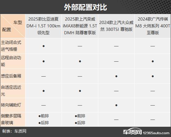 在外部配置方面,比亚迪夏的整体性能更加全面。它还配备了自适应远近光、前后侧窗多层隔音玻璃和远程启动功能,日常使用体验更好。相比之下,大众威然和传祺 M8 总体表现一般,都缺少多种装备。在这些车型中,大众威然仍然是四款车中唯一一款没有提供远程启动功能的车型。