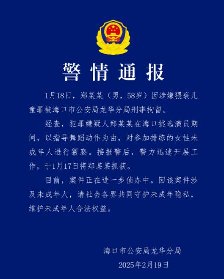 1月18日,郑某某(男,58岁)因猥亵儿童罪被海口市公安局龙华分局拘留。经调查,犯罪嫌疑人郑某某以指导舞蹈动作为由,在海口选拔演员期间猥亵参加排练的未成年女性。接到报警后,警方迅速开展工作,并于1月17日逮捕了郑某某。目前,该案正在进一步调查中。