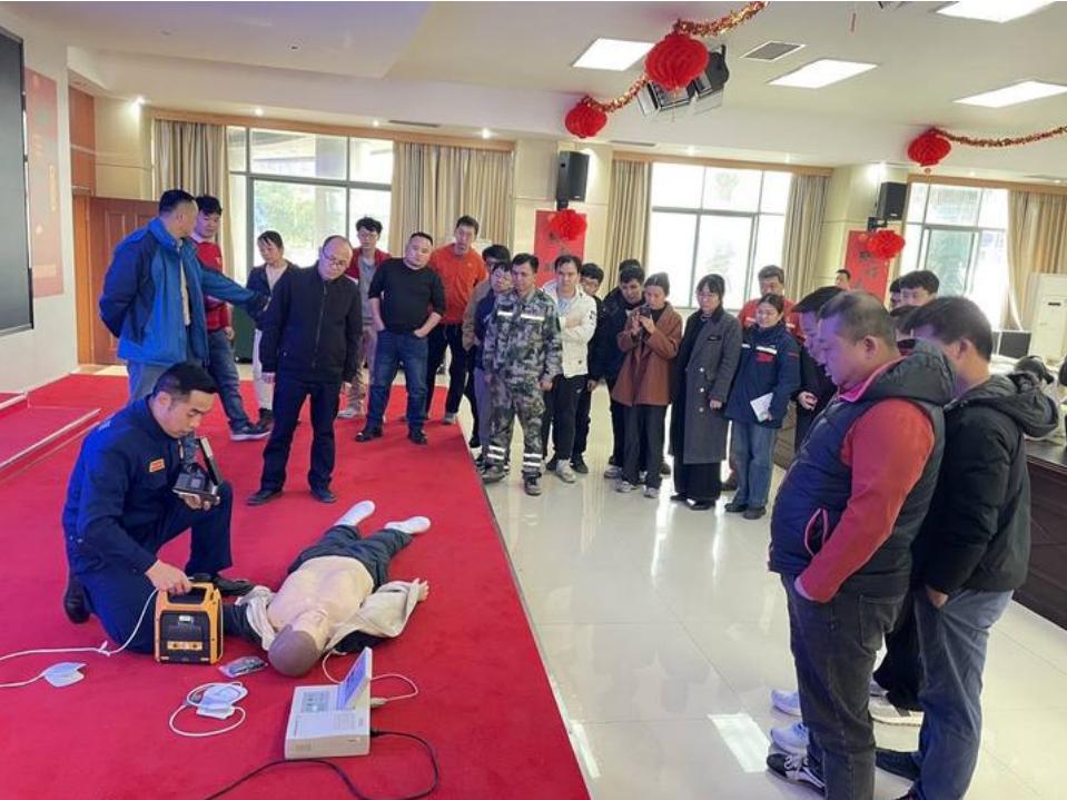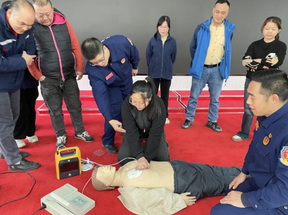 在培训现场,华锡队培训师详细讲解了除颤器的工作原理、使用步骤、适用场景、日常维护等。,并指出了在关键时刻拯救生命的重要性,强调在“黄金4分钟”中使用对提高患者存活率的重要性,并现场演示了操作流程。在华锡队培训师的专业指导下,培训员工积极上台进行实践演练,将所学理论知识转化为实践技能,增强了员工的自我保护意识,提高了每个人的实践技能水平。