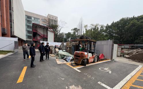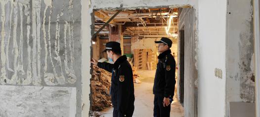 执法人员在打浦桥街道上,密切关注现场安全施工问题。检查员来到打浦路某商厦,该商厦目前正在进行大规模的内部装修工程。执法人员在检查过程中,重点关注施工现场的安全性,对比设计图纸,详细检查承重墙是否损坏。由于商业建筑靠近海华社区,执法队员为了不影响附近居民的日常生活,找到了施工方负责人,提醒他们在施工过程中注意施工安全,落实文明施工的要求。