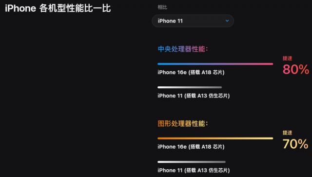 但是还有一点要吐槽的是,苹果在其官网上的“产品对比”中, iPhone 11 作为 iPhone 16e 默认比较目标。不能理解, A18 在芯片口碑普遍良好的情况下,真的有必要拉到一个 2019 年度商品,来展示性能提升吗?