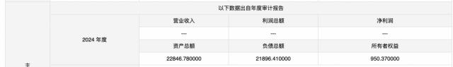 据 2024 年审计报告显示,目标企业尚无营收净利,其总资产 2.28 负债总额为亿元 2.19 亿元,所有者权益 950.37 万元。