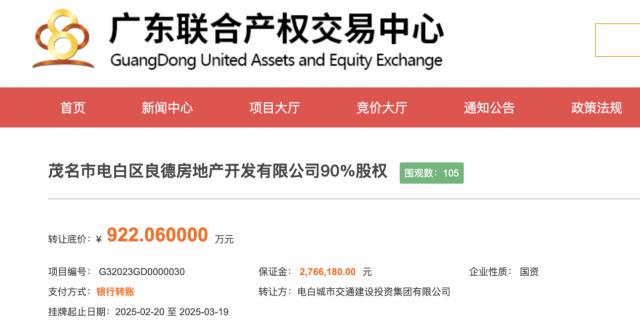 茂名电白良德地产90%股份的电白城交建投挂牌转让,底价922万元