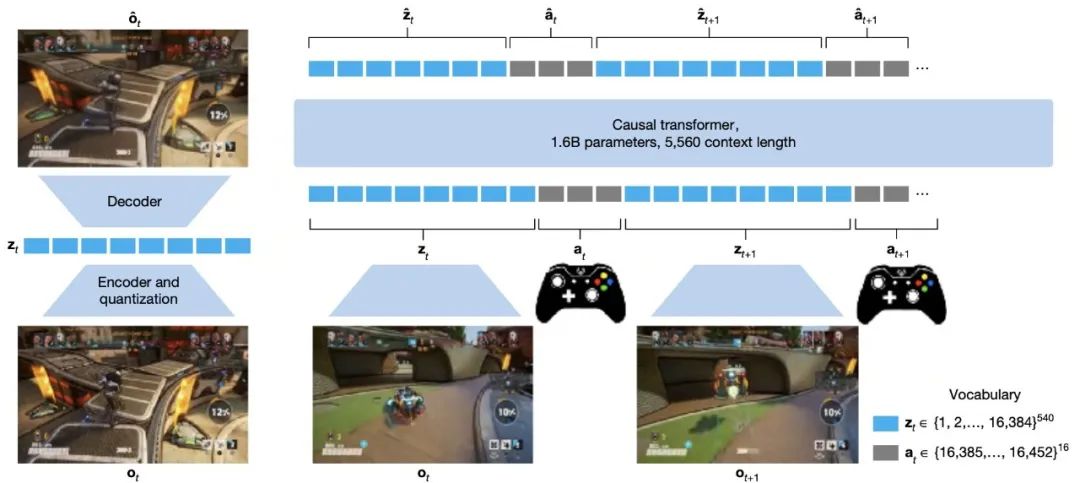 WHAM 模型使用了 3D 多玩家战斗模拟器《嗜血边缘》中大量的人类玩家玩法数据,包括游戏视觉画面和控制器动作。选择 Transformer 结构作为其序列预测的骨干网络,并且使用 VQGAN 图像编码器将图像编码分散。 token 序列,练习真实的人类游戏玩法数据,WHAM 能准确预测游戏环境? 3D 结构,控制器的动作效果,以及游戏的时空结构。
