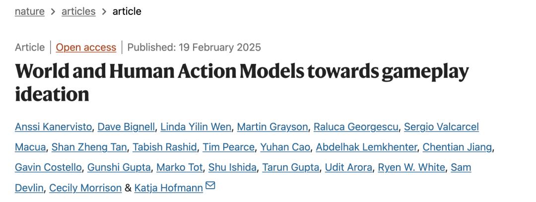 论文报道了一个由微软研究所领导的研究团队,开发的生成式游戏可以帮助电子游戏设计师迭代设计游戏。 AI 模型——世界和人类的行动模式(World and Human Action Model,WHAM),其产生的鲁棒 3D 在电子游戏中,世界可以遵循设计机制。