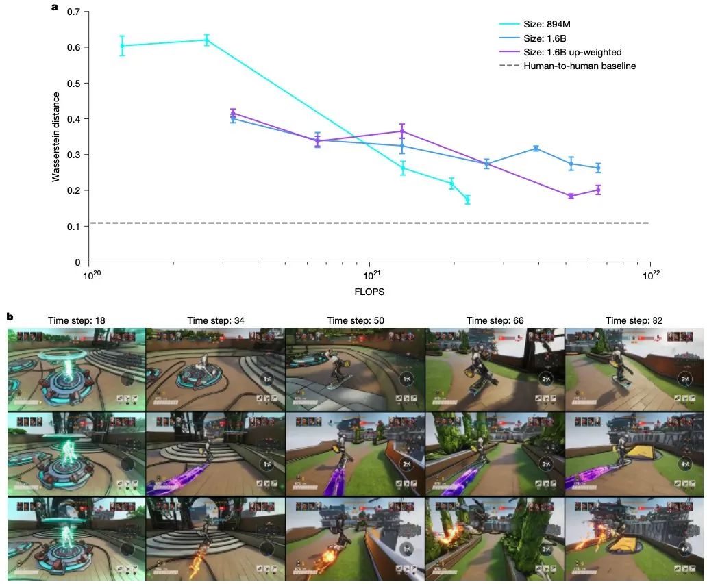 就一致性评价而言,他们使用 Fréchet Video Distance(FVD)用指标来衡量生成的游戏玩法与真实游戏玩法在视觉和时空动态上的一致性。通过将 WHAM 将游戏画面与真实玩家的游戏画面进行对比,发现随着模型规模的增加和计算资源的增加,FVD 结果逐渐下降,说明模型产生的内容与真实游戏数据的一致性不断提高。