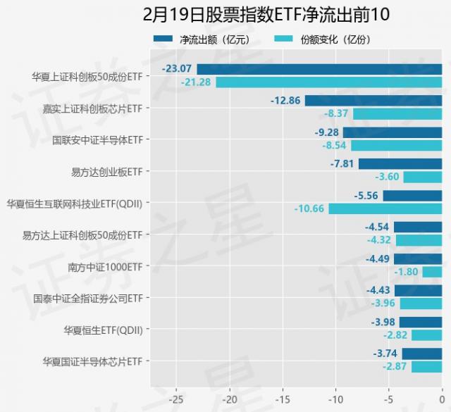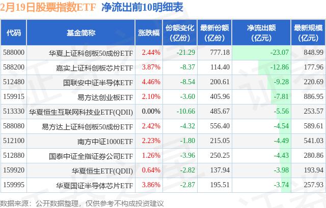 当天有 421 只股票指数 ETF 资金净流出出现在基金中,其中华夏上证科技创新板排名第一。 50 成分 ETF(588000),份额下降 21.29 一亿份,净流出额为 23.07 亿元。