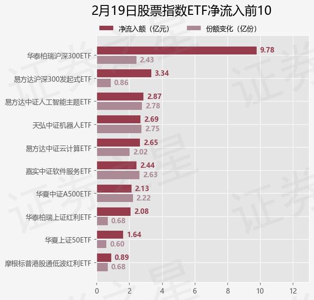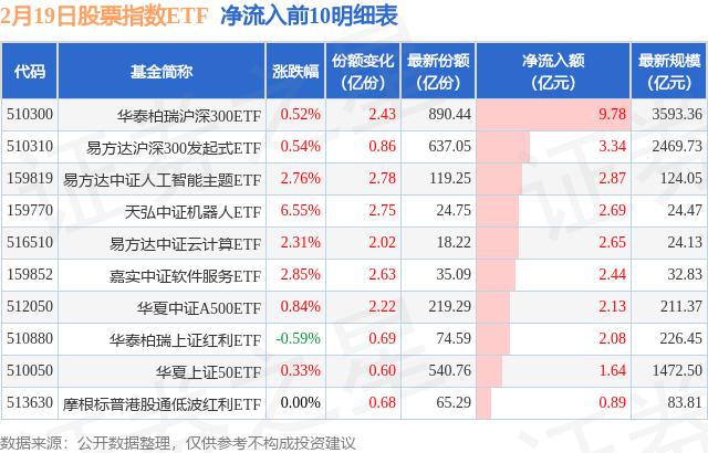 当天有 204 只股票指数 ETF 资金净流入为基金,其中华泰柏瑞沪深圳净流入排名第一。 增加了300ETF(510300)的份额 2.43 十亿份,净流入额为 9.78 亿元。