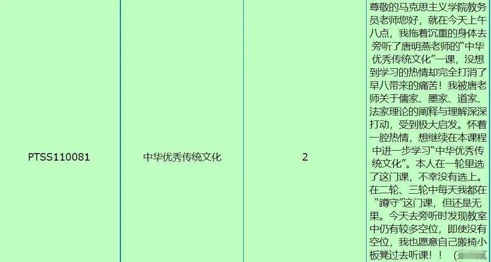 很多同学选不上课,还提交了特别申请:“我被唐老师对儒家、墨家、道家、法家理论的解读和理解深深打动。即使没有地方,我也愿意自己搬凳子去上课……”