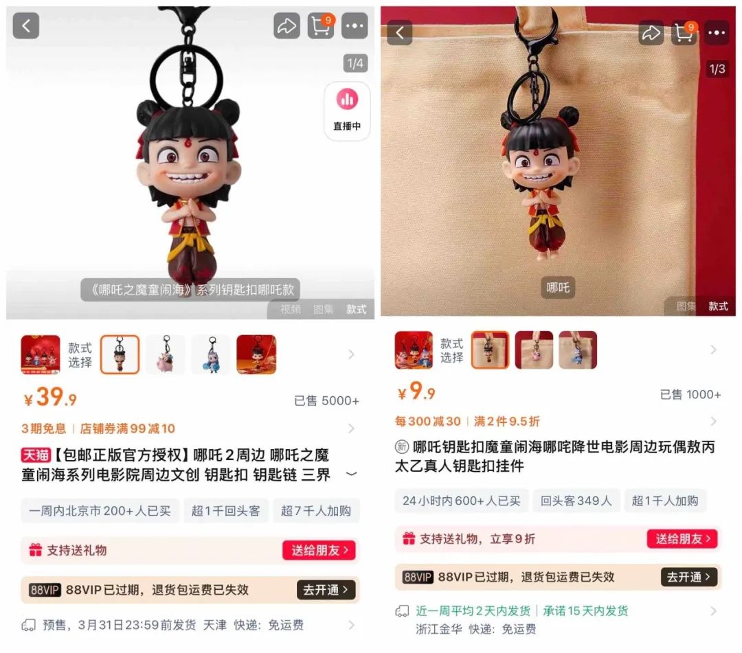 除供不应求外,价格也是影响原市场的关键因素。原版哪吒衍生品一般定价较高,例如中信出版的官方授权钥匙扣价格为39.9元,但在同一平台上,未经授权的“仿造”钥匙扣价格仅为原版的四分之一。
