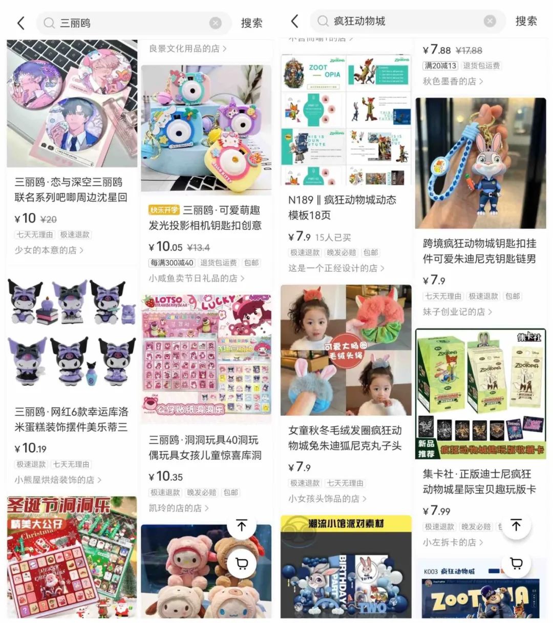 盗版衍生品生产门槛低,市场参与者众多,其营销渠道通常依赖于小商品批发市场和电子商务平台上的小商店。这类商店规模小,流通性高,即使被投诉下架,也可以迅速换店重新开业。