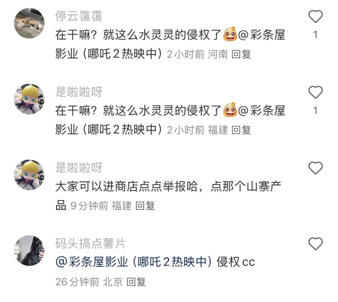 面对盗版衍生品的泛滥,哪吒IP的很多忠实粉丝不仅坚持支持正版,还积极参与维权行动。在社交平台上,粉丝的留言经常可以在盗版周边产品的推广贴下看到,指出产品侵权,并主动提醒官方维权。
