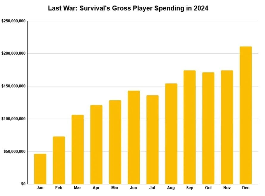 在2024年初,《Last War》开始快速发展。同年9月,游戏累计收入超过10亿美元——当时是迄今为止最赚钱的月份,月收入达到1.75亿美元,但到了12月,这一记录被刷新到2.11亿美元。