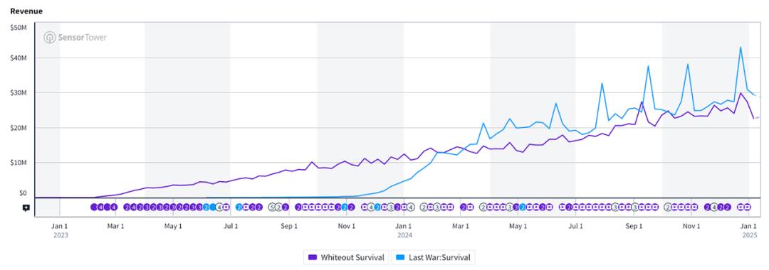 可以说,《Last War》是目前国产SLG手机游戏中的代表性产品之一。为什么是其中之一?因为根据Sensor 根据Tower数据,另一款同样具有代表性的国产SLG手机游戏《Whiteout Survival》(以下简称“无尽冬日”)也即将在2月底,累计收入超过20亿美元。