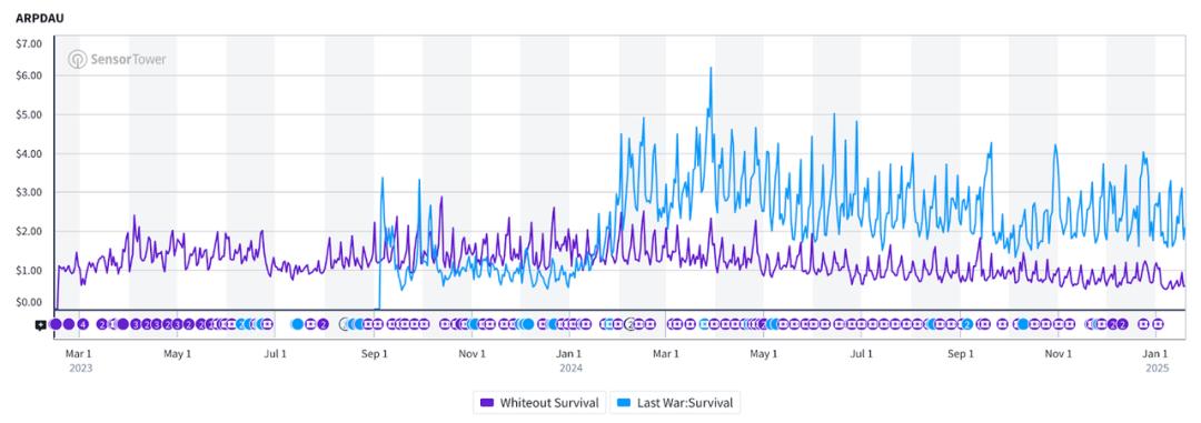 (《Last War》iOS美国市场每个客户的日均收入与《无尽冬日》相同。(ARPDAU)对比)