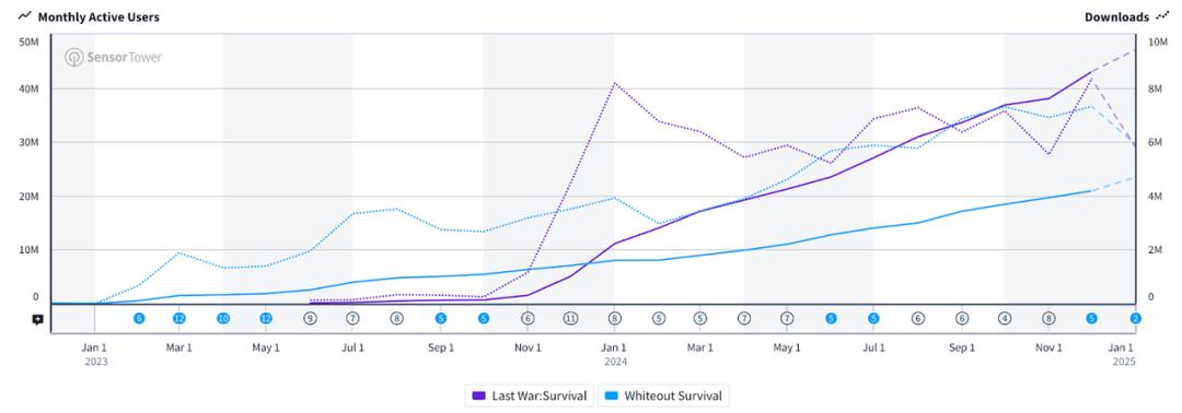 (《Last War》全球月活跃用户数与《无尽冬日》(MAU,实线)与月度下载量(斜线)对比