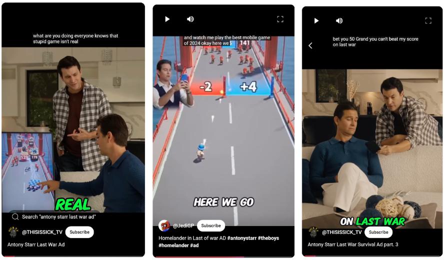 2024年第四季度,《Last War》安东尼·斯塔尔和演员在一起(Antony Starr)通过合作,在TikTok和Snapchat上推出了一系列优秀的广告。热播电视剧的斯塔尔《The Boys》在中中扮演“护国超人”(Homelander)。斯塔尔在这些广告中说:“这个游戏叫做《Last War》。这是因为开发者根据广告中的假游戏制作了一款真正的游戏,从而引起了人们的关注。”