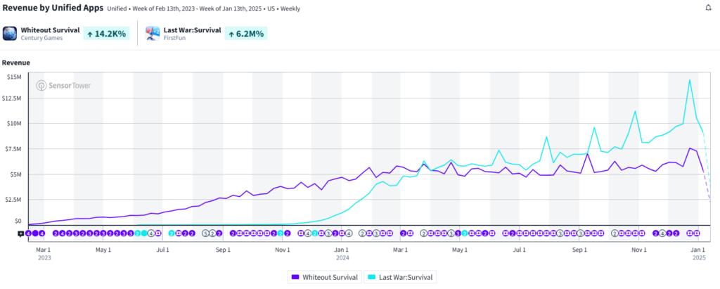 然而,让《Last War》与竞争对手(尤其是这一细分领域的领导者《无尽冬日》)相比,它所表现出来的惊人收益增长速度。