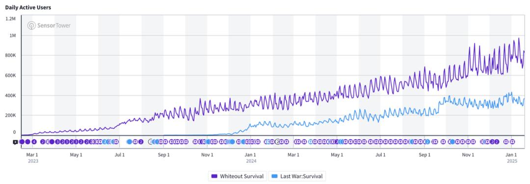 (《Last War》iOS美国市场日活跃用户数与《无尽冬日》一起。(DAU)对比)