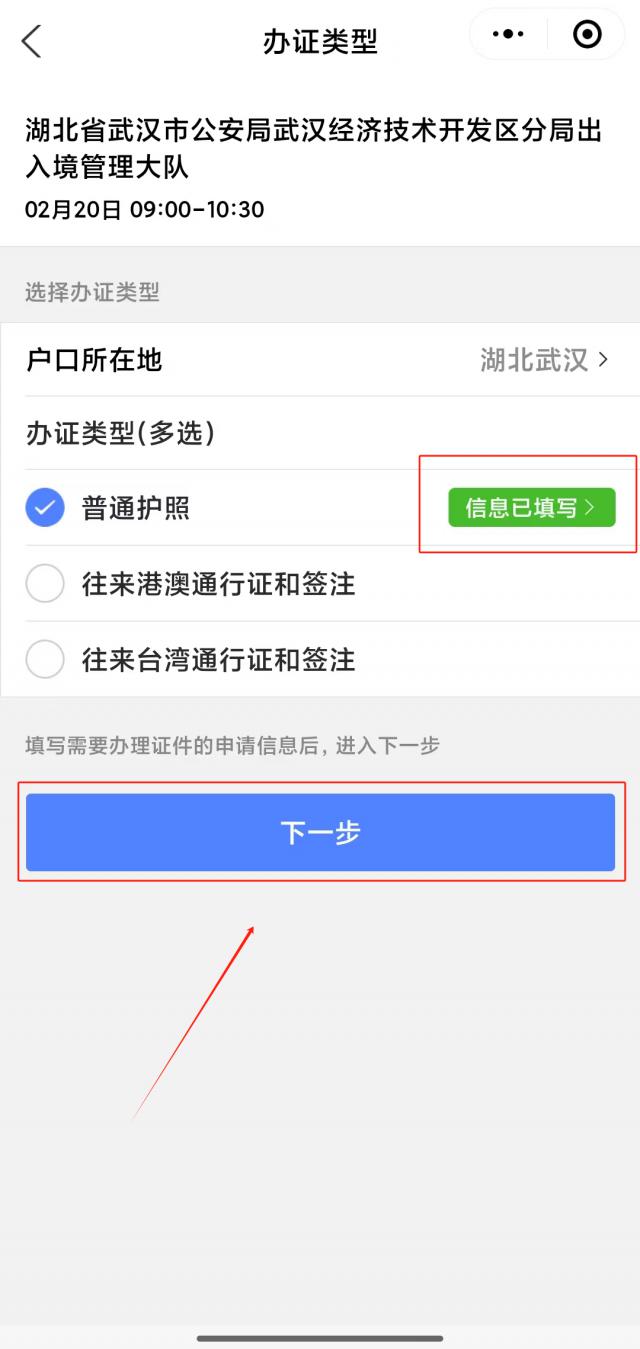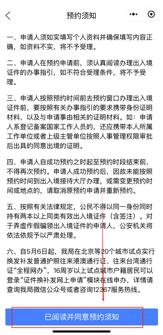 2、然后选择申请类型(普通护照、港澳通行证、签证可以同时选择),根据实际申请要求查看相关选项,完成后点击【下一步】;点击阅读预约须知[阅读并同意预约须知]