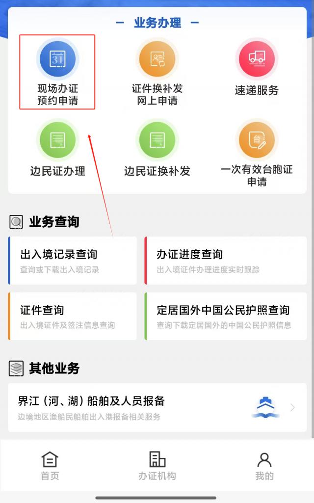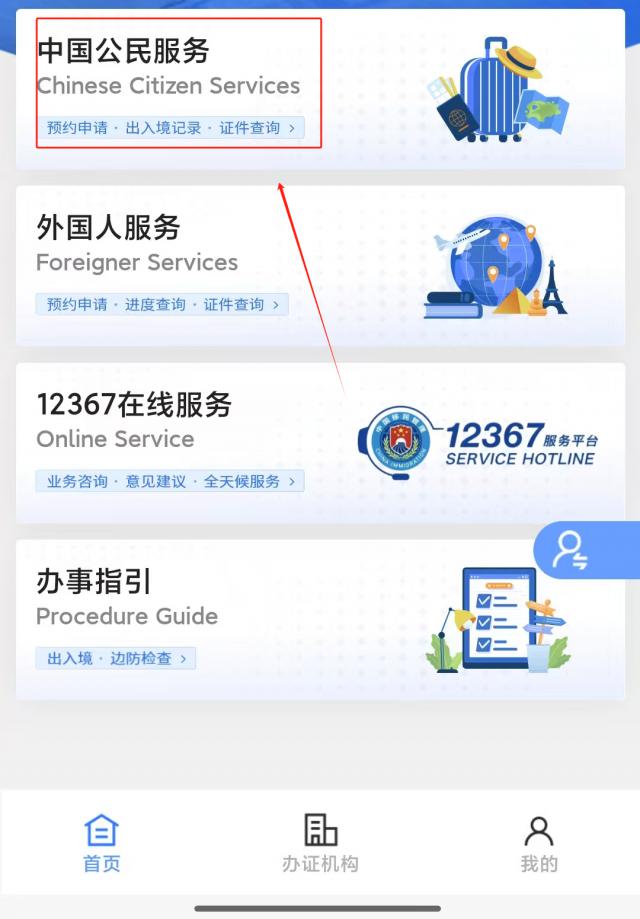 1、寻找“移民局” 12367 “进入官方小程序,然后进行实名认证并登录。点击首页【中国公民服务】后,继续点击【现场办证预约申请】。