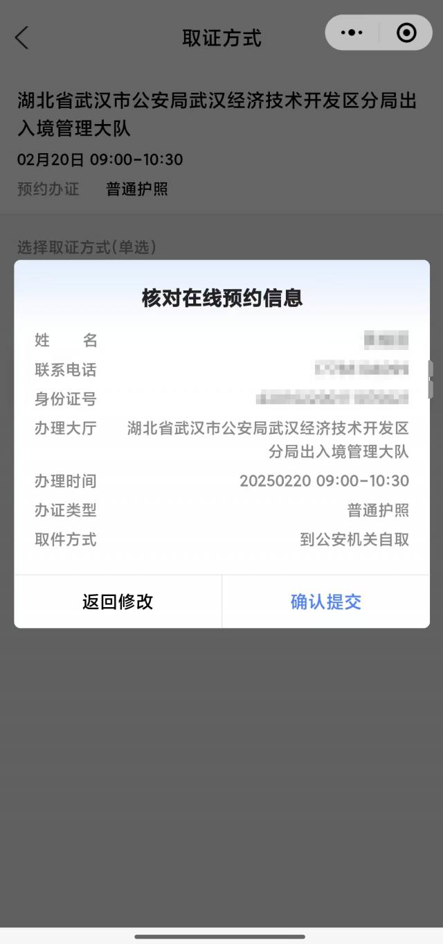 6、如果选择邮政快递,需要添加收件人信息,填写完毕后点击【确认信息】;确认信息后,系统会自动弹出在线预约信息页面。如果您有任何问题,请单击“回到修改”。如果信息正确,可以单击“确认提交”。;