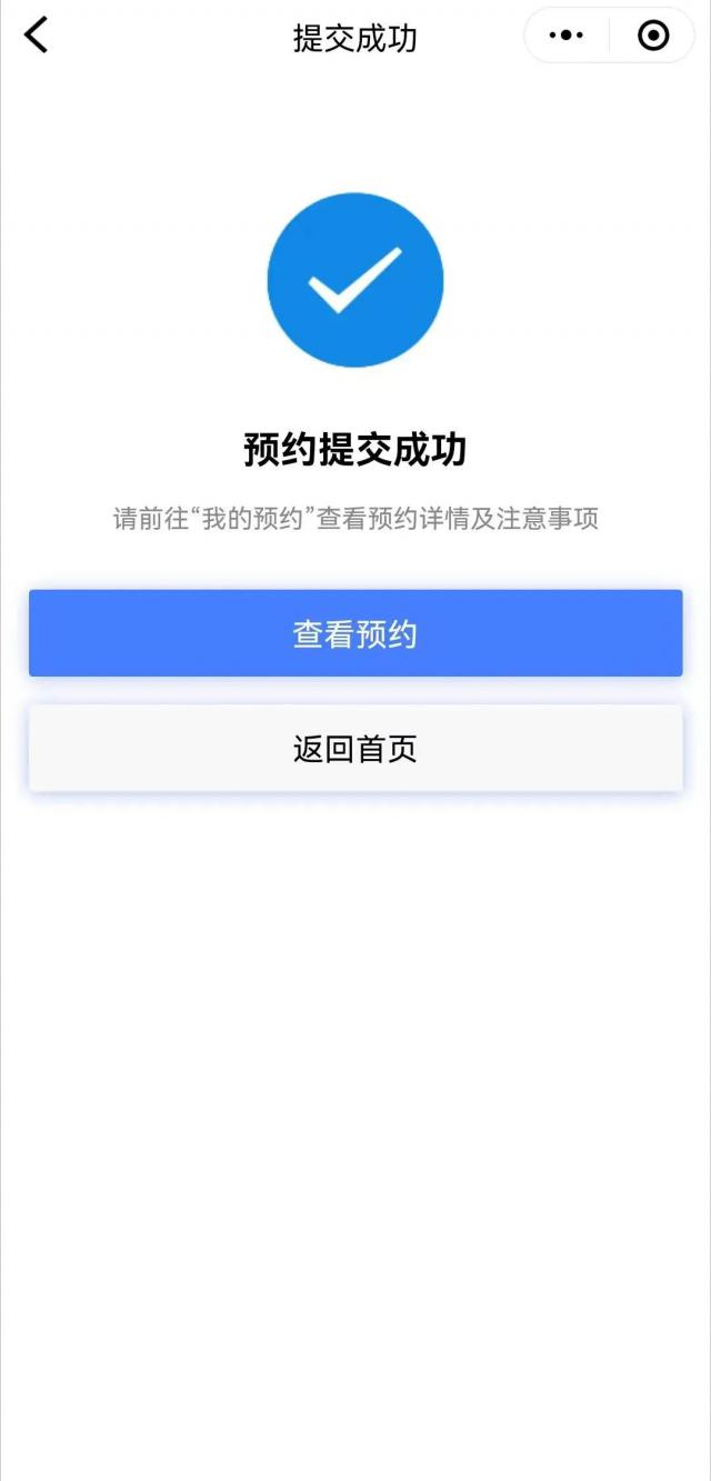 7、提交后,系统会提示【成功提交预约】。可以点击【查看预约】查看预约细节和注意事项。如果后续不能在规定时间内完成,可以依次点击“我的”-“我的预约”-“已预约”-“取消预约”取消预约。