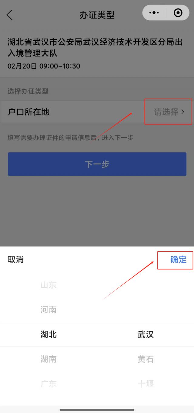 4、通过页面滚动选择户籍所在地,然后选择申请类型(普通护照、港澳通行证、签证可以同时选择),根据实际申请要求查看相关选项,完成后点击【确定】