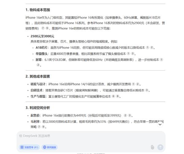 据 DeepSeek 分析,iPhone 16e 作为苹果新一代中端市场的力作,其材料成本可能介于 2500 元到 3000 元之间。
