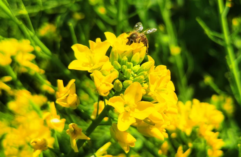 二月九日,云南永仁,鲜花盛开,蜜蜂弯腰忙碌。