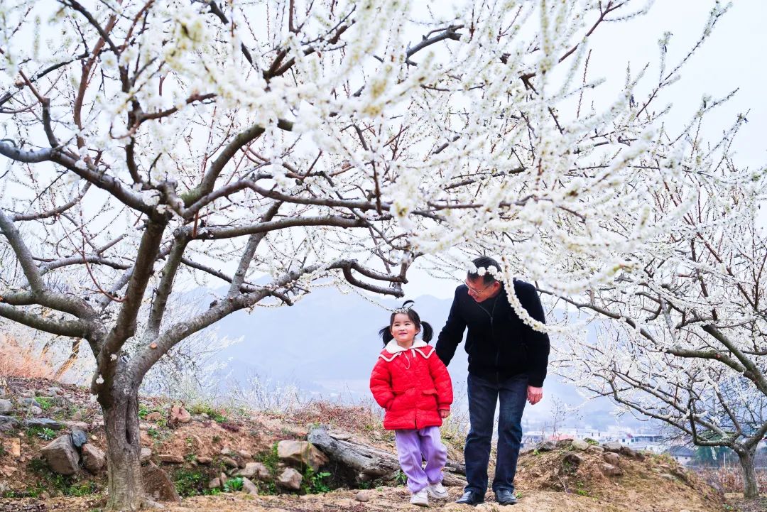 爷爷带着娇孙赏李花,孙女盈盈喜。