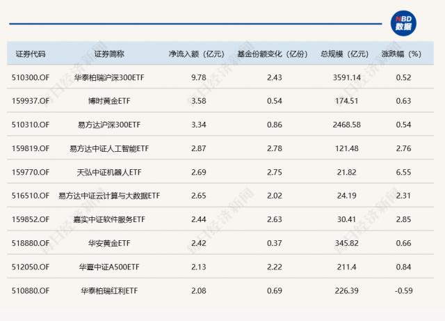 Wind 数据显示,是的 2 月 19 日的非货币 ETF 在市场上,华泰柏瑞沪深 300ETF、博时黄金 ETF、易方达沪深 300ETF 各自净流入 9.78 亿元、3.58 亿元和 3.34 亿元。