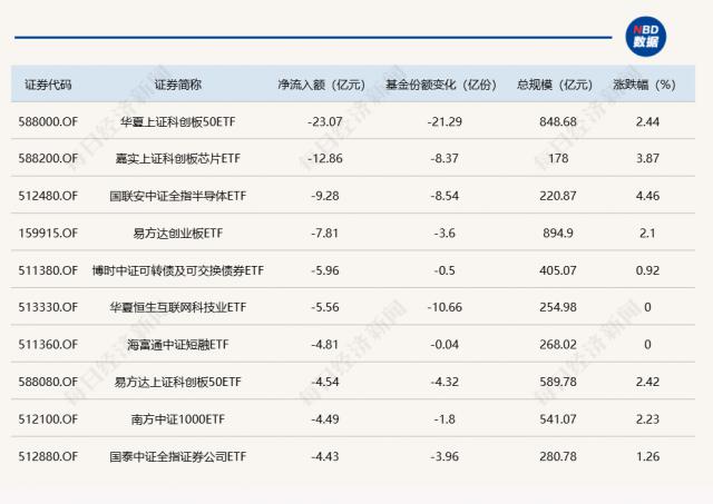 同时,华夏上证科技创新板 50ETF、嘉实上证科创板芯片 ETF、国家联安中证全指半导体 ETF 各自净流出 23.07 亿元、12.86 亿元和 9.28 亿元。