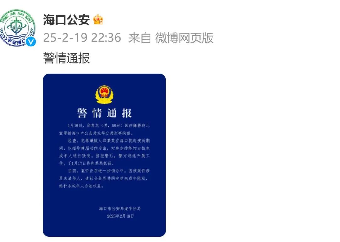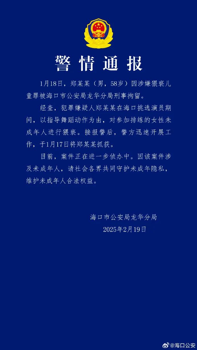 江西导演兼商人郑某峰在海南招募演员时被曝猥亵儿童被警方拘留。昨天深夜,@海口公安局 发布警报通知