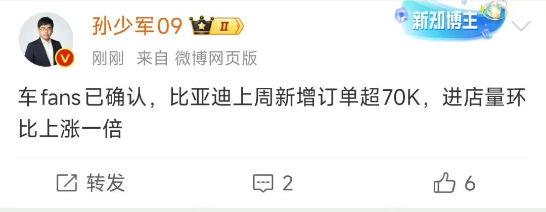 据微博大V孙少军消息,2月10日之后的一周,比亚迪的门店数量翻了一番,新增订单超过7万,比亚迪的股价也达到了历史新高。